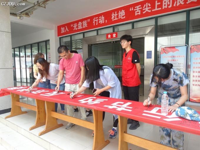 本次活動為期一周,內(nèi)容包括“五個一”:上一節(jié)班會課、出一期黑板報、參加一次光盤換禮品、做一次節(jié)約宣傳、制定一份公約等。宣傳周活動首先通過“節(jié)約糧食”倡議、張貼“節(jié)約糧食”海報、懸掛“杜絕舌尖上的浪費”橫幅等宣傳形式展開,吸引廣大師生踴躍參加。在餐廳門口“厲行節(jié)約 反對浪費”師生簽名活動現(xiàn)場,大家紛紛在橫幅上簽名,表達自己對節(jié)約糧食的積極支持。在餐廳內(nèi),教職工和同學(xué)們努力爭做“光盤族”,積極踐行“節(jié)約糧食,從我做起”的倡議。