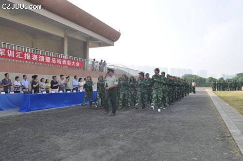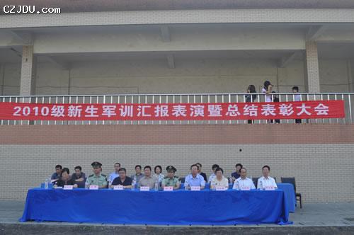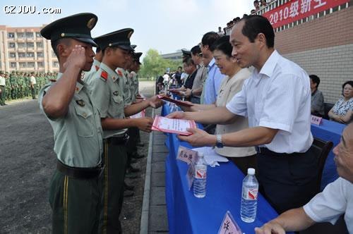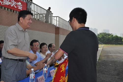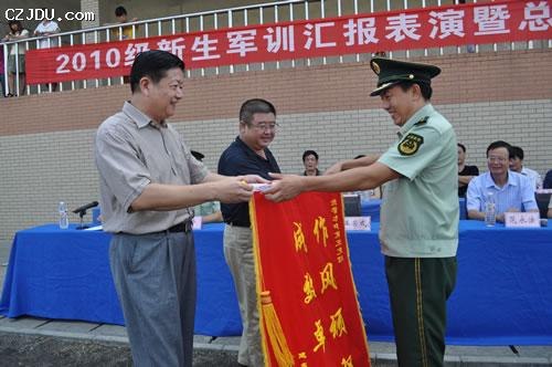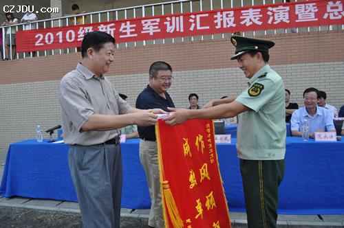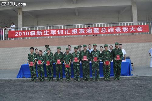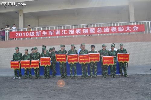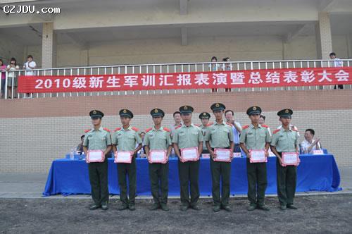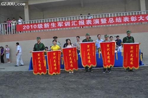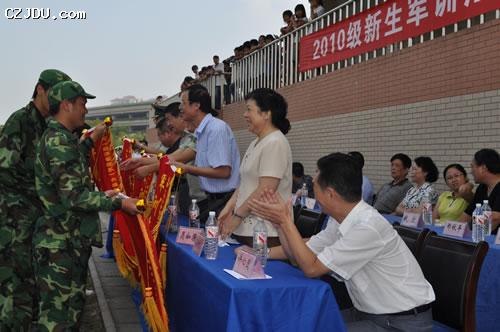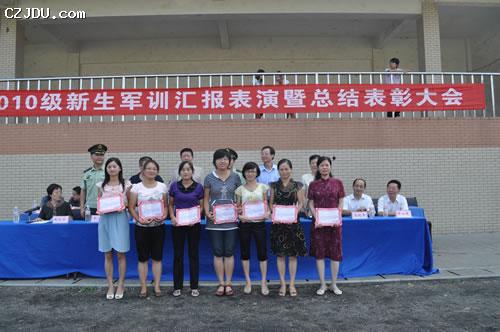 表演結(jié)束后,副院長(zhǎng)吳如漪宣讀了我院《關(guān)于表彰2010級(jí)新生軍訓(xùn)先進(jìn)集體及個(gè)人的決定》。1個(gè)先進(jìn)營(yíng)、6個(gè)先進(jìn)連隊(duì)、30個(gè)衛(wèi)生文明宿舍、7名優(yōu)秀教官、7名優(yōu)秀輔導(dǎo)員、96名軍訓(xùn)積極分子受到了表彰。在歡快的樂(lè)曲聲中,主席臺(tái)前排領(lǐng)導(dǎo)為軍訓(xùn)先進(jìn)集體和優(yōu)秀個(gè)人頒獎(jiǎng)并合影留念。院長(zhǎng)王榮成、副院長(zhǎng)丁高明還向部隊(duì)授予了錦旗。